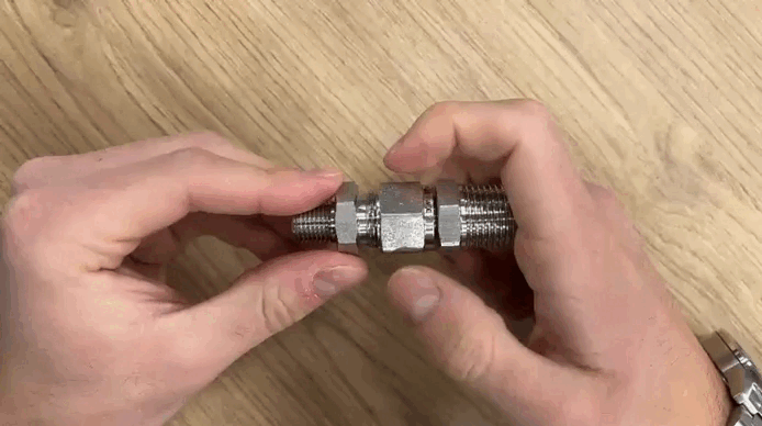 En otras palabras, funciona como los acoples de una manguera de jardín: cuando conectas la manguera al grifo, giras la tuerca de la punta de la manguera en vez de tener que girar toda la manguera. De igual modo, una tuerca giratoria en instrumentación te deja apretar una unión sin retorcer el manómetro, válvula o componente conectado al otro extremo. Esto es crucial cuando ese dispositivo tiene que quedar orientado correctamente (por ejemplo, que la esfera del manómetro mire de frente al operario).